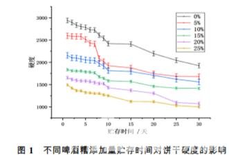 由圖 1 可知,啤酒糟添加量為 10% 、15% 、20% 、 25% 的餅干的硬度變化趨勢明顯低于未添加啤酒糟的餅干。另外,未加啤酒糟的餅干硬度在貯存過程中 下降幅度較大,而添加啤酒糟的餅干硬度在貯存過程 中下降幅度相對較小,而且隨著啤酒糟加量增加,貯 存過程下降幅度也有縮小的趨勢。
