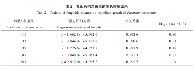 選取 2 種藥效作用較好的藥劑進行復配,以 EC50濃度按照不同比例配比,配比為 1∶ 1, 1∶ 3,1∶ 5,3∶ 1,5∶ 1。再在不同比例配比下設置 5 個濃度梯度,濃度稀釋按照逐級稀釋法稀釋濃度,實驗按 照 1. 2. 2 和 1. 2. 3 中所述方法進行。