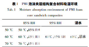 1) 浸水環境下,石英纖維增強環氧樹脂面 板、PMI 泡沫以及相應的 PMI 泡沫夾層結構復合 材料都具有嚴重的吸濕行為,吸濕速率和飽和吸濕率很大。