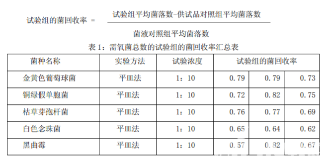 試驗(yàn)組:分別按上述菌落計(jì)數(shù)方法進(jìn)行試驗(yàn)組菌落的計(jì)數(shù)。 菌液對(duì)照組:以稀釋液代替供試品溶液,按照試驗(yàn)組的菌落計(jì)數(shù)方法試驗(yàn)。 供試品對(duì)照組:按菌落計(jì)數(shù)方法,不加試驗(yàn)菌,測定供試品本底菌落數(shù)。 陰性對(duì)照試驗(yàn):用刻度吸管吸取稀釋液 1ml 置直徑 90mm 的無菌平皿中,注入 15~20ml 熔化的胰酪大豆胨瓊脂培養(yǎng)基或沙氏葡萄糖瓊脂培養(yǎng)基,混勻,倒置培養(yǎng)。陰性對(duì)照試驗(yàn)應(yīng) 無菌生長。如果陰性對(duì)照有菌生長,應(yīng)進(jìn)行偏差調(diào)查。 培養(yǎng)條件:需氧菌總數(shù)計(jì)數(shù)方法適用性試驗(yàn)時(shí),金黃色葡萄球菌,銅綠假單胞菌,枯草 芽孢桿菌培養(yǎng)溫度為30~35℃,培養(yǎng)時(shí)間3~5天;白色念珠菌和黑曲霉培養(yǎng)溫度為30~35℃, 培養(yǎng)時(shí)間 5 天。霉菌和酵母菌總數(shù)計(jì)數(shù)方法適用性試驗(yàn)時(shí),白色念珠菌和黑曲霉培養(yǎng)溫度為 20~25℃,培養(yǎng)時(shí)間 5 天。結(jié)果見表 1,表 2。 結(jié)果判斷: