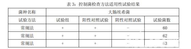 適用性試驗(yàn),霉菌和酵母菌總數(shù)計(jì)數(shù)方法適用性試驗(yàn)和控制 菌檢查方法適用性試驗(yàn),分別要進(jìn)行三次試驗(yàn)。結(jié)果見表 3。