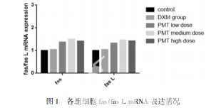 與空白 對照組相比,平目湯各組 fas、fas L 蛋白表達均上調(diào),差異有 統(tǒng)計學(xué)意義( P < 0. 05) ,地塞米松組無統(tǒng)計學(xué)差異( P > 0. 05) 。在升高 fas 表達方面,平目湯高劑量組與平目湯中 劑量組、平目湯低劑量組比較,差異有統(tǒng)計學(xué)意義( P < 0. 05) 。平目湯中劑量組與平目湯低劑量組比較,無統(tǒng)計學(xué) 差異( P > 0. 05) 。